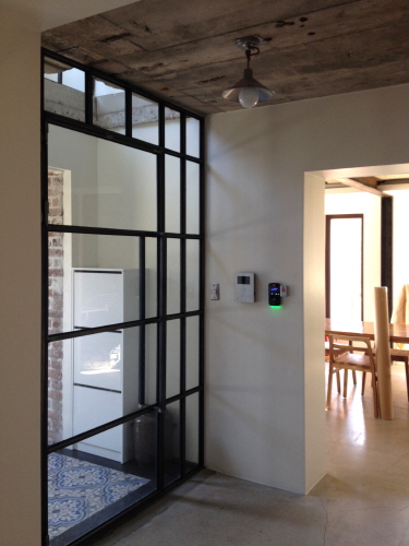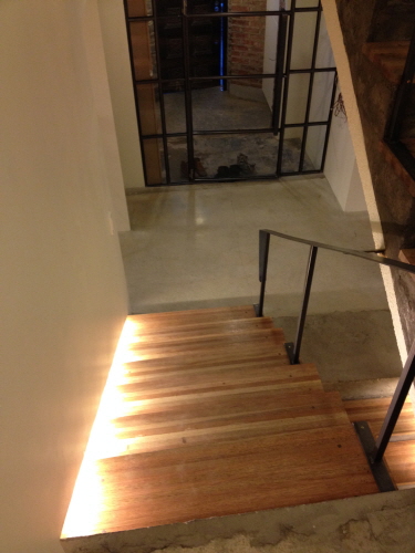 실내에 남아있게되는 기존집의 벽돌들. 계단실 쪽에 면한 벽의 벽돌 텍스춰와 외부 벽쪽의 기존 붉은 벽돌 벽은