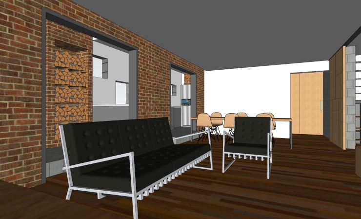1차 설계안- 통창으로 보이는 벽난로가 이집의 아이콘이 된다.