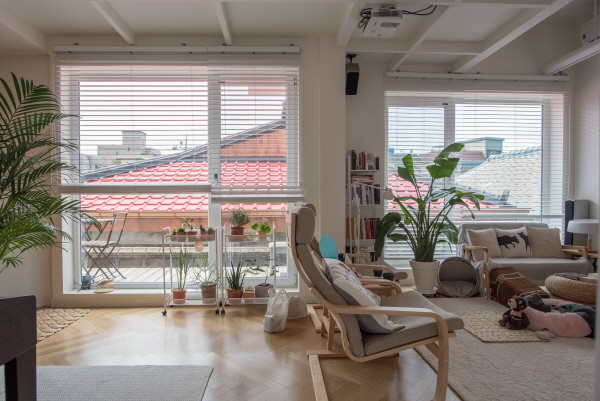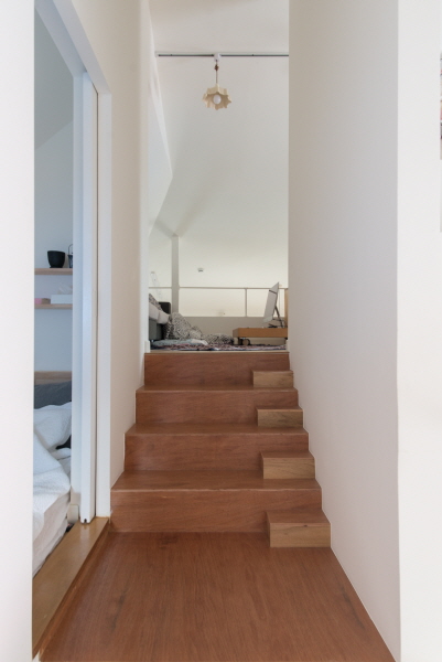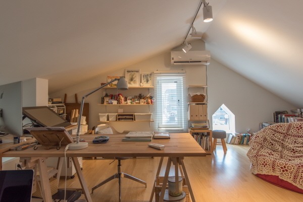 사무실에서 디자인한 가장 작은 주택이다. 집돌이 젊은 부부를 위한 20평집 리모델링 프로젝트. 작은예산이지만 만족스러운 결과가 나와서 다행이었다. 특히 이전 집의 기억-집의 레벨-을 그대로 가져와 새로운 공간으로 바꾼 것이 재미있는 요소다. 낮은 부엌은 드레스룸이 되고, 다락은 침실이 되고, 쓰지않던 지붕속 공간은 동화작가의 작업실이 되었다. 외부의 화장실 건물은 남편의 서재가 되고 거실은 부부만을 위한 영화관이 되었다. 매일매일 여행하는 기분으로 집에 돌아온다는 부부의 말은 내게 최고의 찬사다.