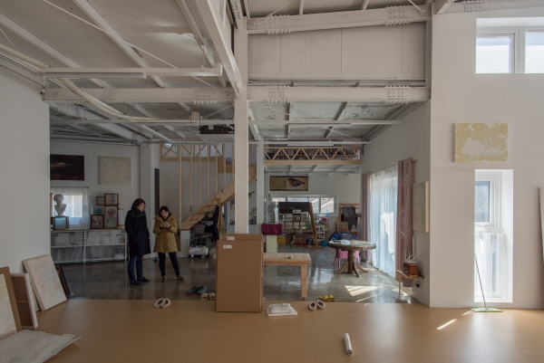 2층의 창문은 5미터 높이의 작업 벽에 걸린 그림에 직사광선이 비추지 않도록 하면서 최대한 자연광을 끌어들이도록 노력했다. 천장의 구조를 노출하고 페인트만 칠했는데 이게 제법 멋있다. 마치 갤러리 같은 느낌이 든다.